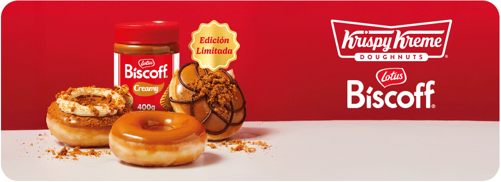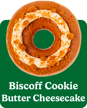 Original Glazed Doughnut cubierta con Biscoff Creamy Cookie Butter, remolino de crema cheesecake y decorado con crumble de galleta Biscoff.